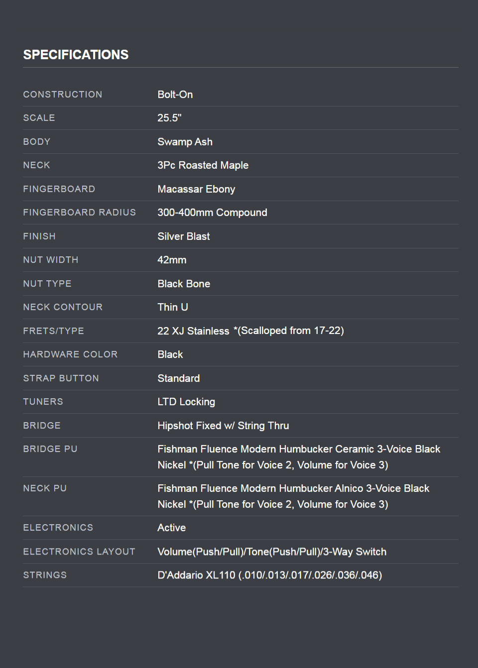 Çϵå¿þ¾î »ç¾çÀ¸·Î´Â LTD ¶ôÅ· Æ©³Ê, ºí·¢ º» ³ÊÆ®, ½ºÆ®¸µ-½º·ç ±¸Á¶ÀÇ Hipshot ÇϵåÅ×ÀÏ ºê¸®Áö°¡ Àû¿ëµÇ¾ú½À´Ï´Ù. ÇȾ÷Àº ºê¸´Áö¿¡ ¼¼¶ó¹Í, ³Ø¿¡ ¾Ë´ÏÄÚ ÀÚ¼®À» »ç¿ëÇÑ Fishman Fluence Modern Çè¹öÄ¿ Á¶ÇÕÀ¸·Î, Ǫ½Ã/Ç® ÄÁÆ®·ÑÀ» ÅëÇØ ´Ù¾çÇÑ º¸À̽º¸¦ ¼±ÅÃÇÒ ¼ö ÀÖ½À´Ï´Ù.